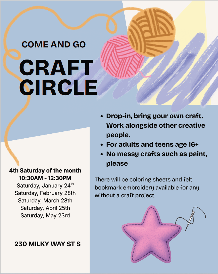 The Craft Circle program will continue once a month January through May on the 4th Saturday of the month. The dates are January 24, February 28, March 28, April 25, and May 23. Drop in between 10:30 a.m. and 12:30 p.m. and bring your own craft to work on alongside other creative people. No messy crafts such as paint and dye, please, in order to protect the library’s carpet. No craft of your own? The library will provide coloring sheets and felt bookmarks to embroider. Open to adults and teens age 16 and up. No need to sign up.