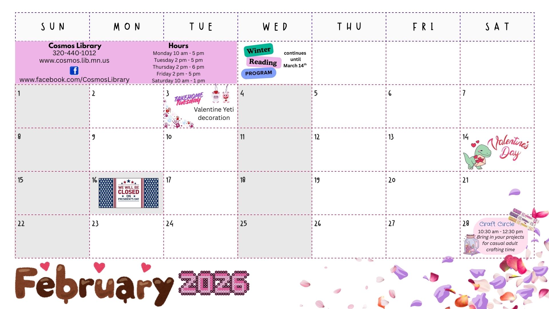 The library will have Valentine’s Day take-home craft kits for kids available beginning February 3. The craft is a foam yeti with hearts.