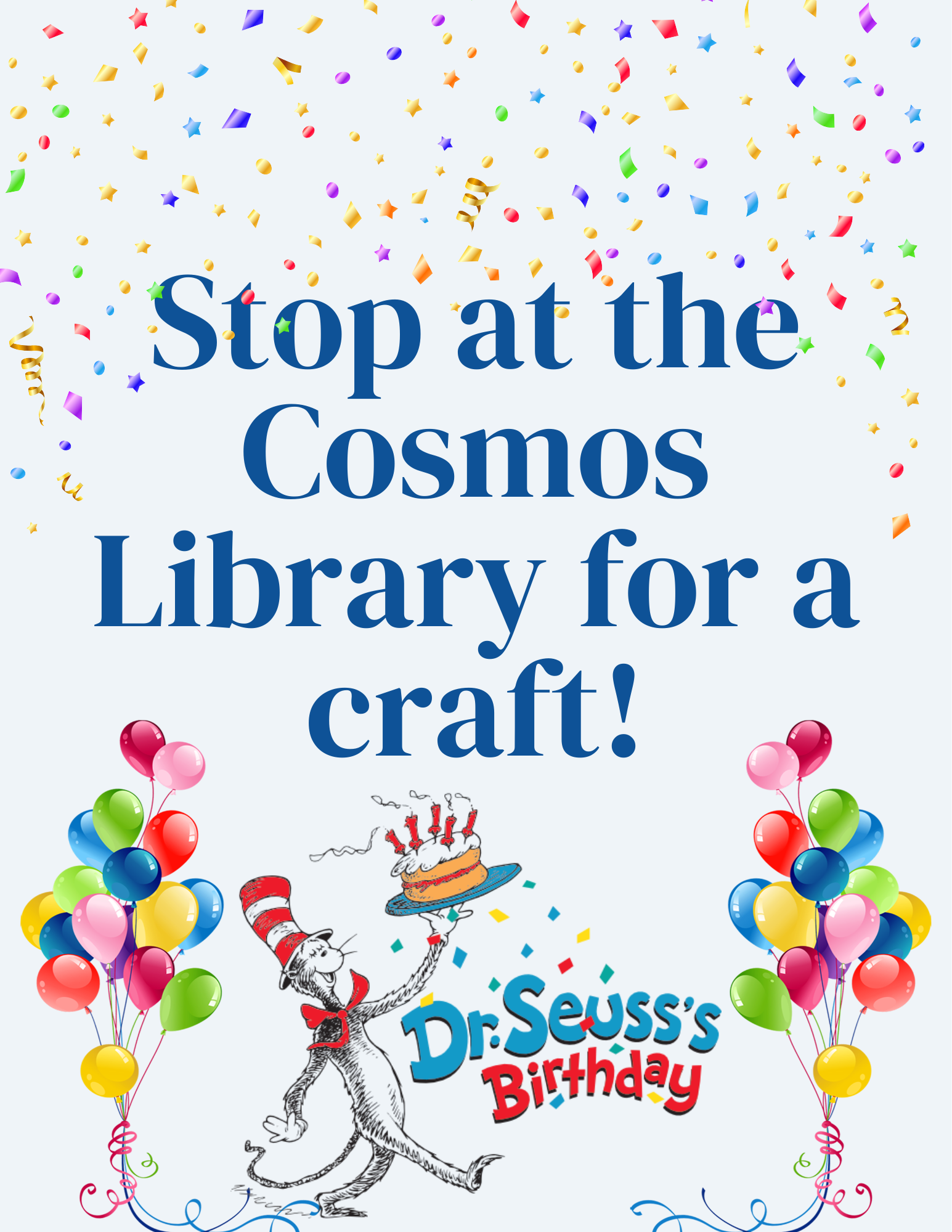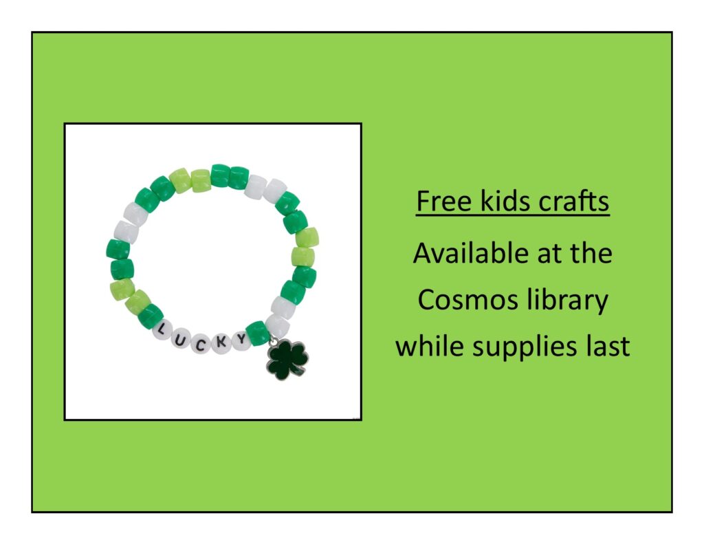 The winter reading program continues all month and though the first half of March at the Cosmos Library. Stop in to sign up and you’ll get a book bag, while supplies last. You’ll also get a reading log to track and rate the books you read beginning the day you sign up. If you read 3 books by the time the program is done on March 14, you can choose a small prize. If you read 3 more, you can pick an additional prize. The program can be completed only once per year.