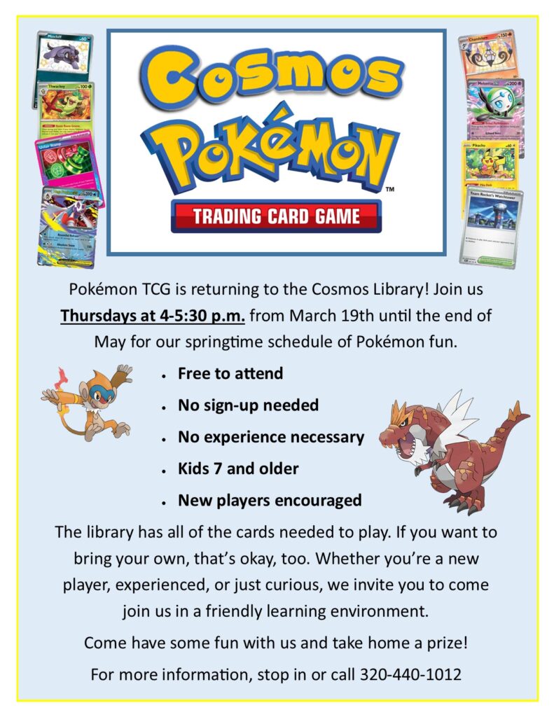 Cosmos Library is starting Thursday afternoon Pokémon Trading Card Game time again! Beginning March 19, this program will be offered every Thursday through May 28, 4-5:30 p.m. Open to kids ages 7-18. Children under age 8 must be accompanied by an adult or teen caregiver. Caregivers are welcome to stay with kids at any time.