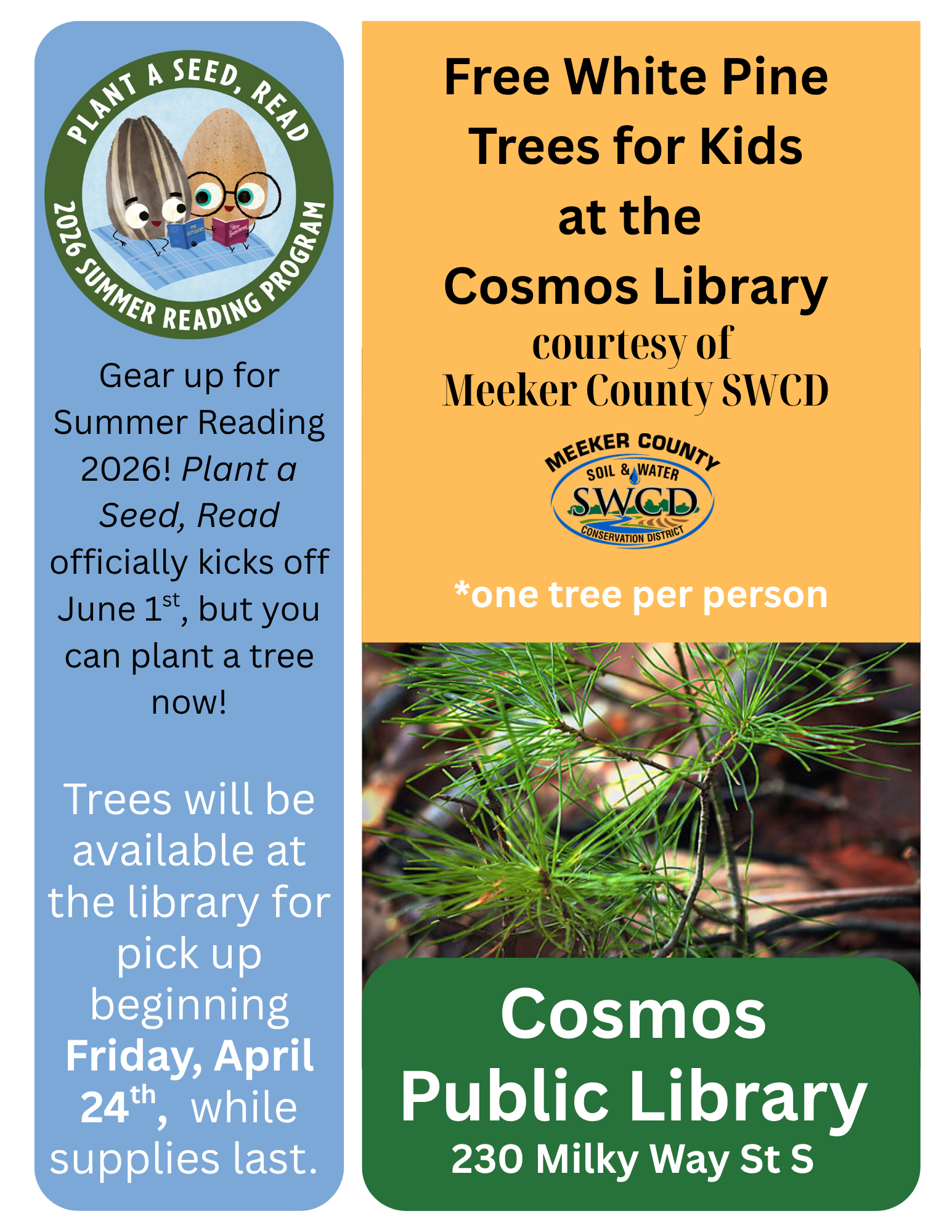 Cosmos Library’s hours are Mondays 10-5, Tuesdays 2-5, Thursdays 2-6, Fridays 2-5, and Saturdays 10-1. Find us in city hall, at www.cosmos.lib.mn.us, or at 320-440-1012.